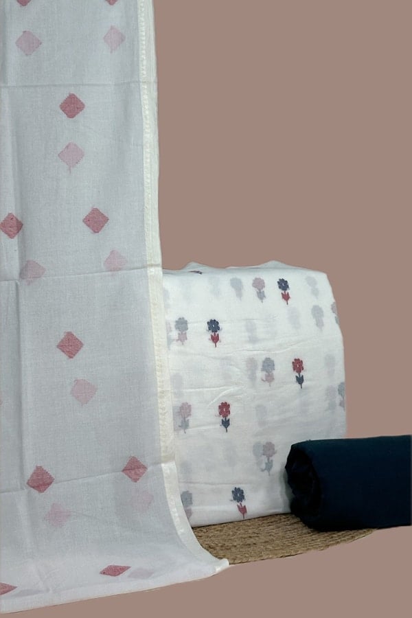 3Pc Handloom Cotton Dupatta with Woven Motif Top & Handloom Soft Cotton Bottom Fabric Set