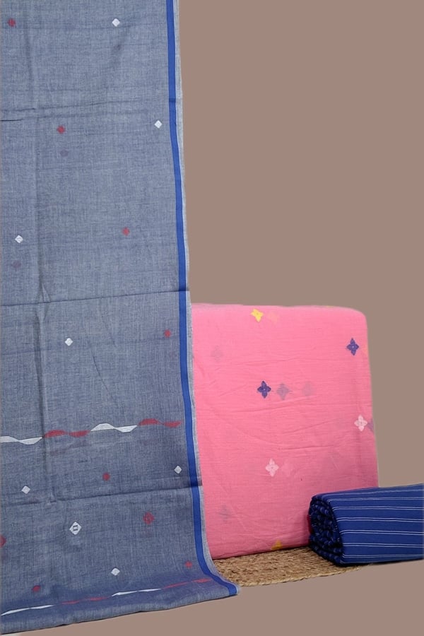 3Pc Handloom Cotton Dupatta with Woven Motif Top & Handloom Stripe Soft Cotton Bottom Fabric Set