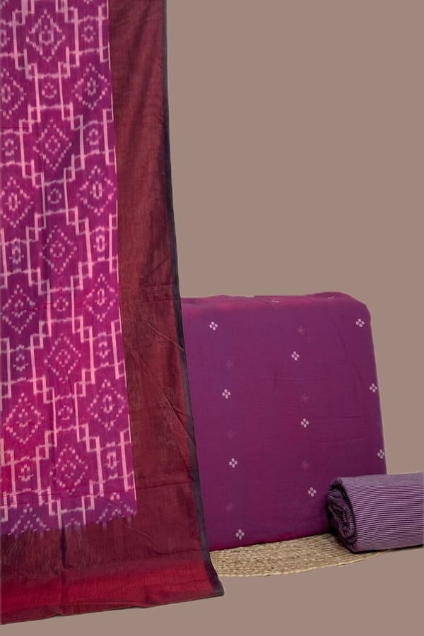 2.5mtr Each – Ikkat Cotton Dupatta with Hand Handloom Woven Motif Cotton Top And Handloom Soft Cotton Bottom Fabric Set