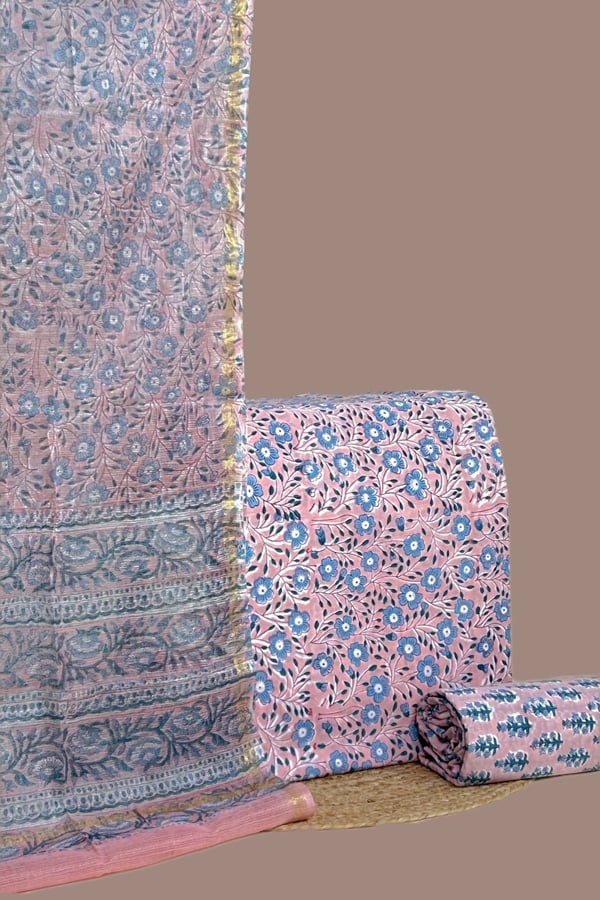 2.5mtr Each – Kota Doria Dupatta with HandBlock Printed Pure Soft Cotton Top and Bottom Fabric Set