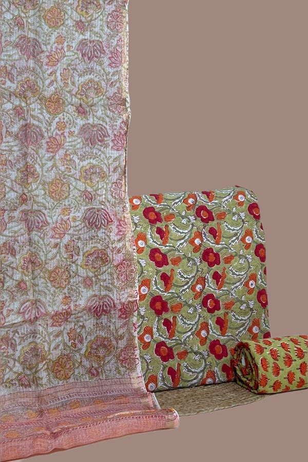 2.5mtr Each – Kota Doria Dupatta with HandBlock Printed Pure Soft Cotton Top and Bottom Fabric Set