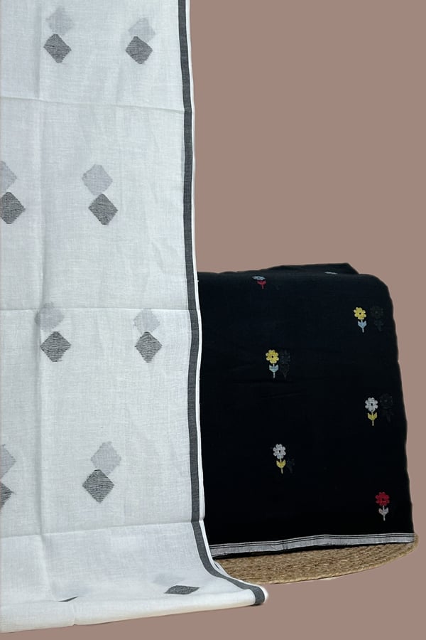 3Pc Handloom Cotton Dupatta with Jamdani Intricate Border Top & Handloom Soft Cotton Bottom Fabric Set