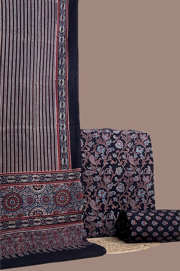 2.5mtr Each Natural Dye Ajrakh HandBlock Printed Dupatta and Top Bottom Fabric Set