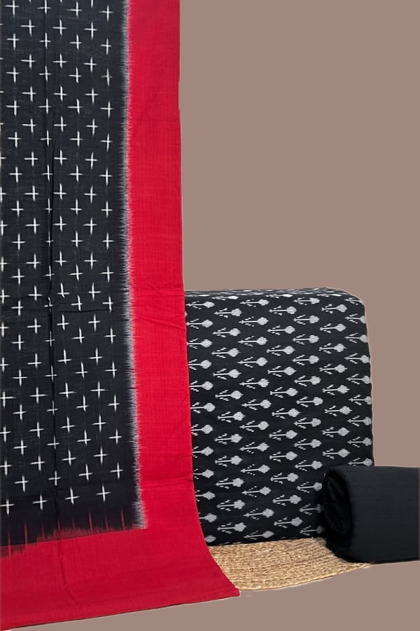 Black – 3pc Ikkat Cotton Dupatta with Soft Ikkat Top And Handloom Soft Cotton Bottom Set