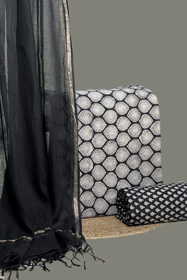 Black – 3pc Kota Doria Dupatta with Bagru Blockprint Cotton Top & Bottom Set