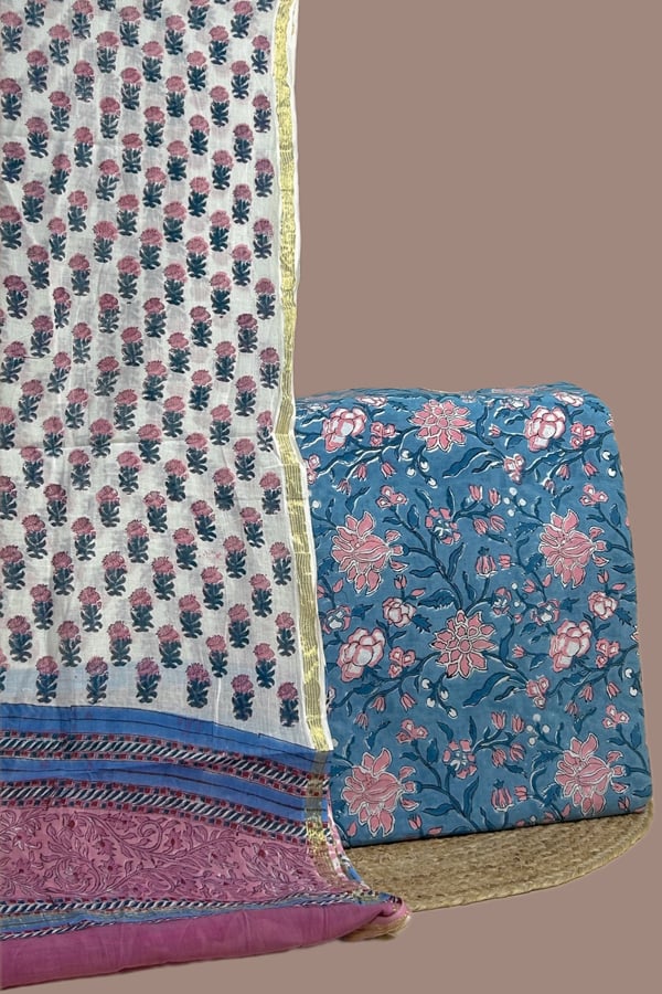Blue – 2pc Blockprinted Cotton Dupatta and Pure Soft Cotton Top Fabric Set