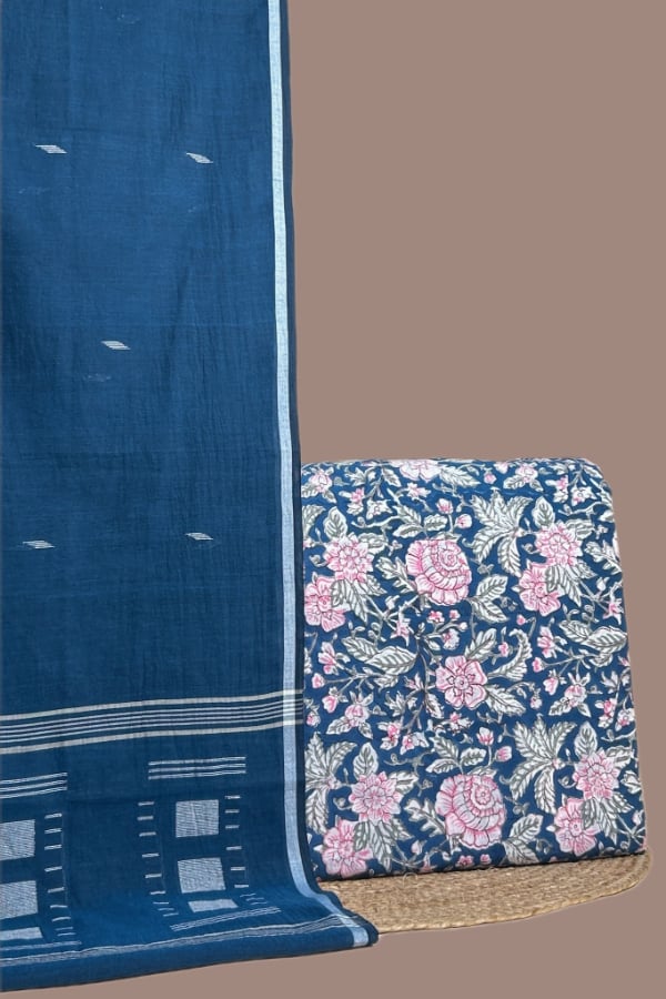 Blue – 2pc Handloom Cotton Dupatta and Blockprinted Soft Cotton Top Set