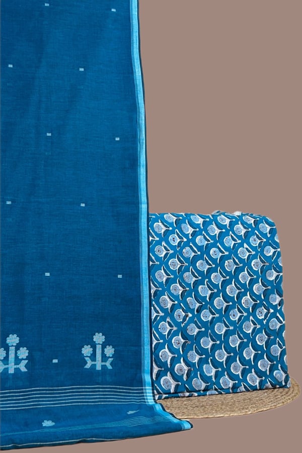 Blue – 2pc Handloom Cotton Dupatta and Blockprinted Soft Cotton Top Set