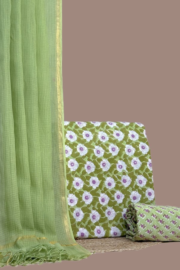 Green - 3pc Kota Doria Dupatta with Blockprint Soft Cotton Top & Bottom Set