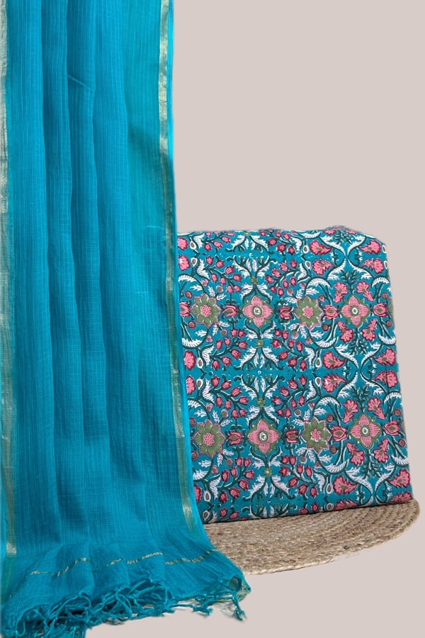 2.5mtr Each – Kota Doria Dupatta with HandBlock Printed Pure Soft Cotton Top Fabric Set