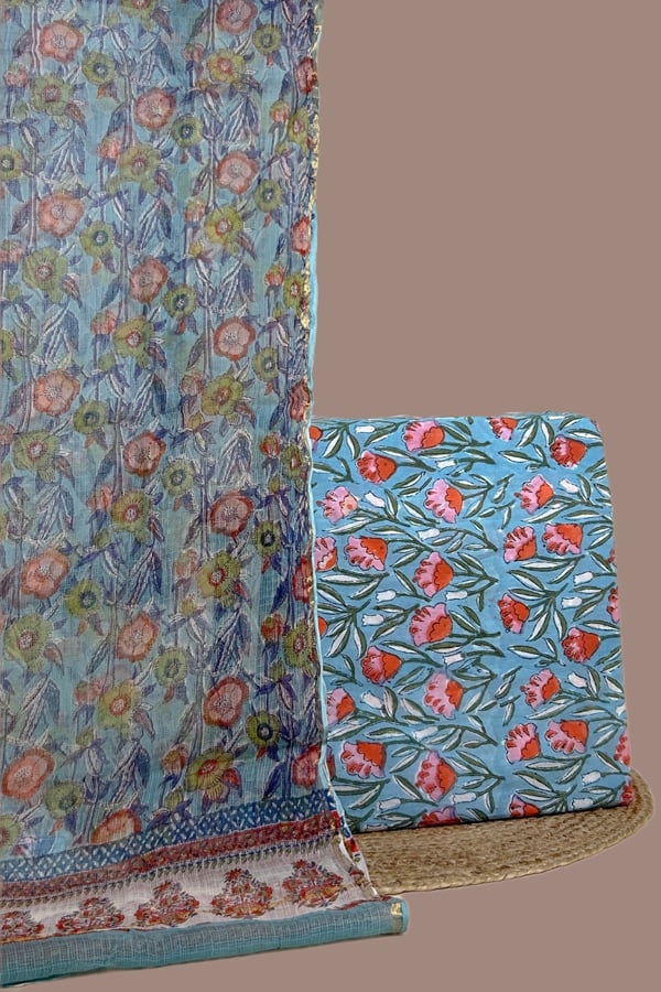 Blue – 2pc Kota Doria Dupatta and Pure Soft Cotton Blockprint Top Fabric Set