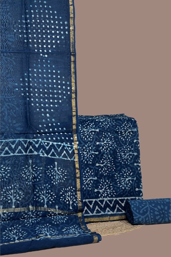 Blue – 3pc Chanderi Silk Dupatta and Top Fabric with Cotton Blockprint Bottom Fabric Set
