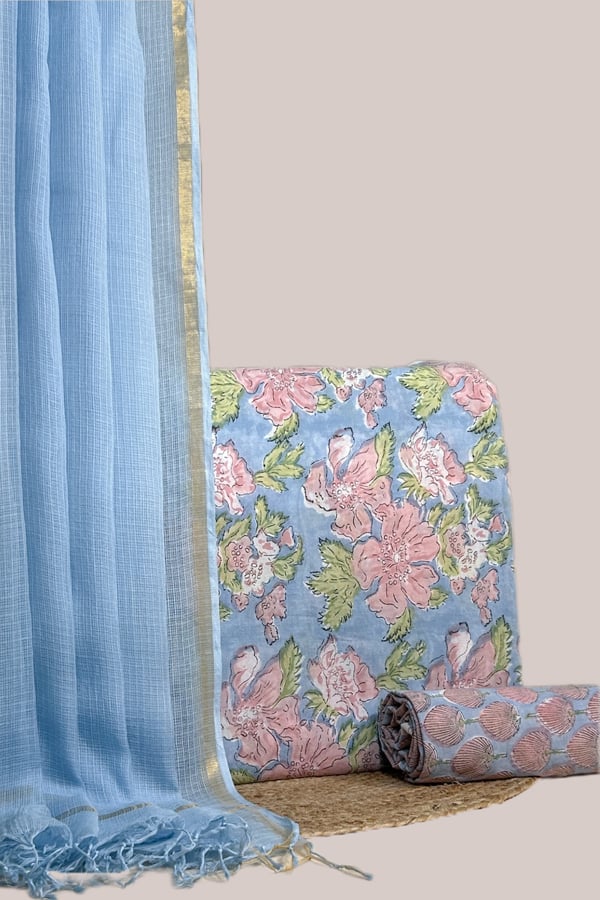 Blue – 3pc Kota Doria Dupatta with Blockprint Soft Cotton Top & Bottom Set