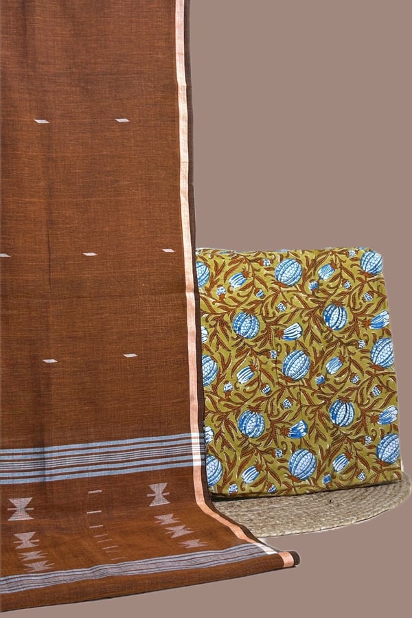 Brown – 2pc Handloom Cotton Dupatta and Blockprinted Soft Cotton Top Set