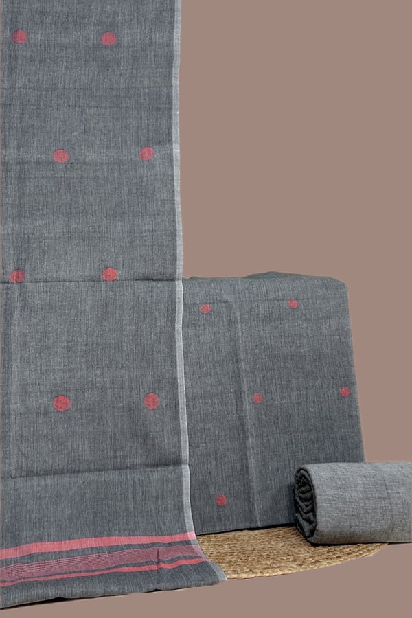 Gray – 3Pc (3mtr Top) Handloom Cotton Dupatta with Woven Motif Top & Handloom Soft Cotton Bottom Fabric Set
