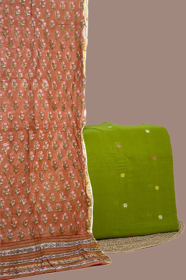 Green – 2pc Chanderi Silk Blockprint Dupatta and Handloom Woven Motif Flowy Soft Cotton Top Fabric Set
