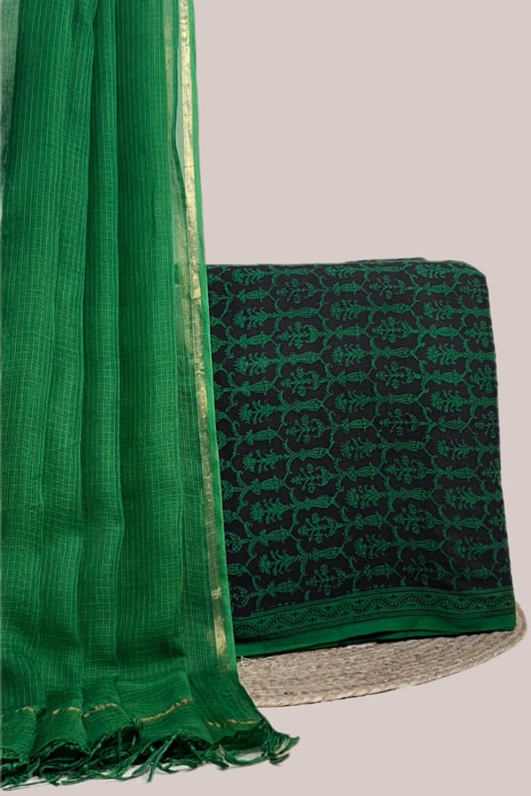 Green – 2pc Kota Doria Dupatta and Bagh Blockprint Top Cotton Fabric Set