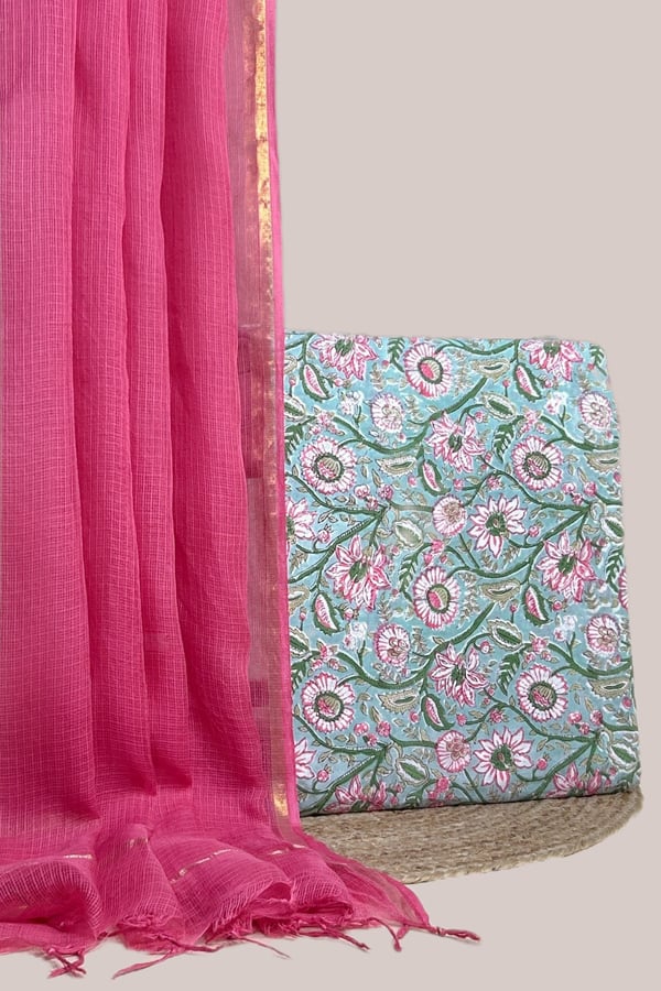 2.5mtr Each – Kota Doria Dupatta with HandBlock Printed Pure Soft Cotton Top Fabric Set