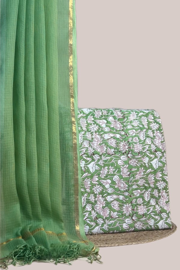 Green – 2pc Kota Doria Dupatta and Pure Soft Cotton Blockprint Top Fabric Set