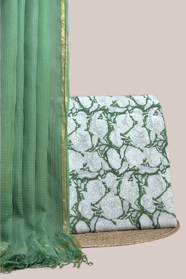 Green – 2pc Kota Doria Dupatta and Pure Soft Cotton Blockprint Top Fabric Set