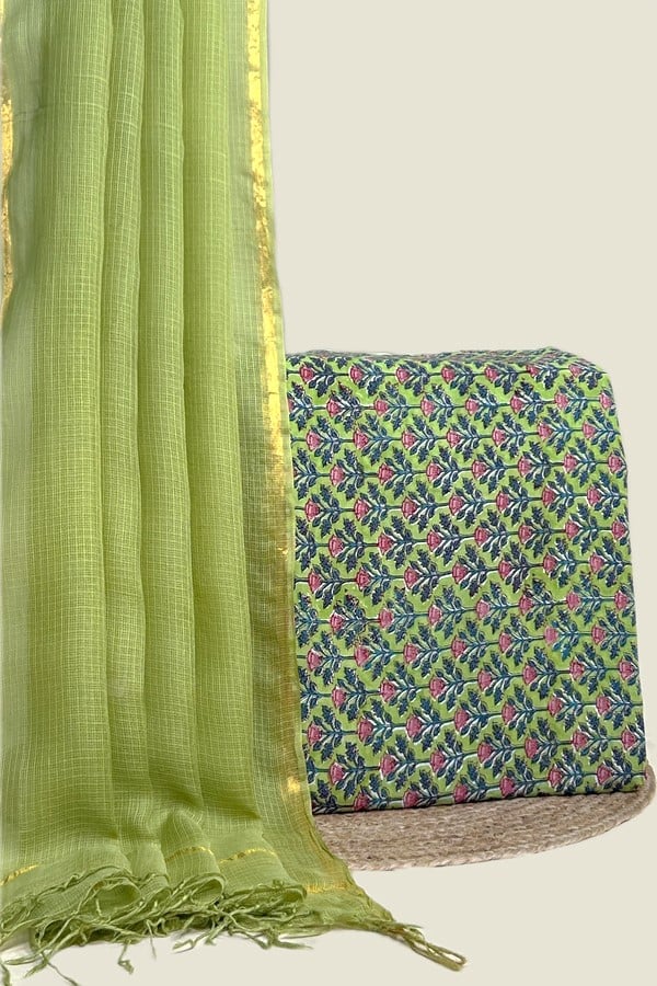 Green – 2pc Kota Doria Dupatta and Pure Soft Cotton Blockprint Top Fabric Set