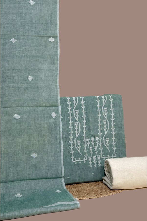 Green – 3Pc (3mtr Top) Handloom Woven Neck Design Soft Cotton Top(3m) Bottom(2.5m) Fabric Set