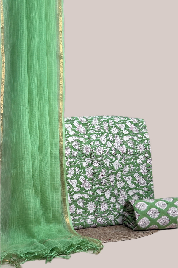 Green – 3pc Kota Doria Dupatta with Blockprint Pure Soft Cotton Top & Bottom Set