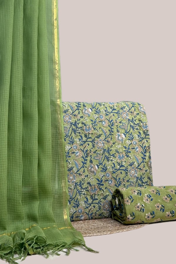 Green – 3pc Kota Doria Dupatta with Blockprint Pure Soft Cotton Top & Bottom Set