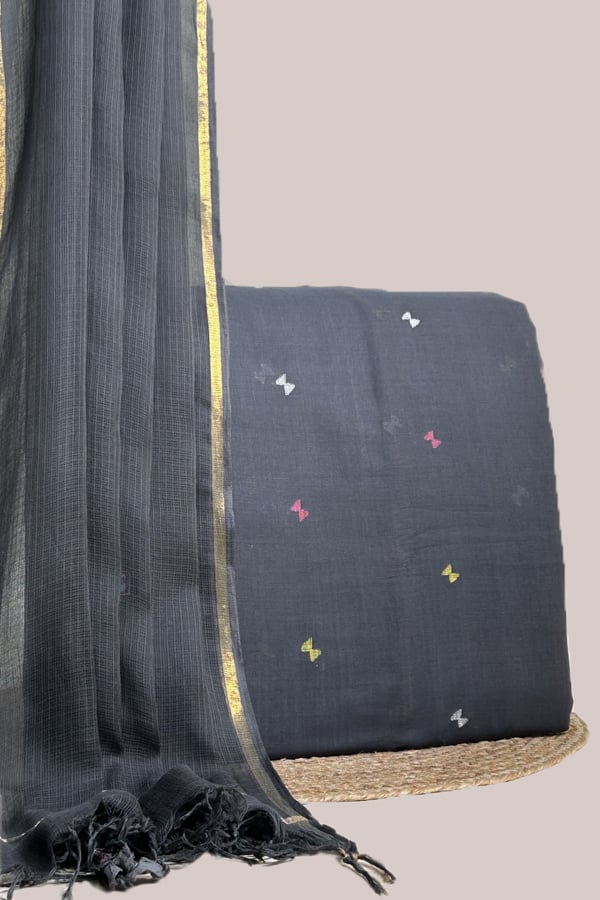 Grey – 2pc Kota Doria Dupatta and Handloom Woven Motif Flowy Soft Cotton Top Fabric Set