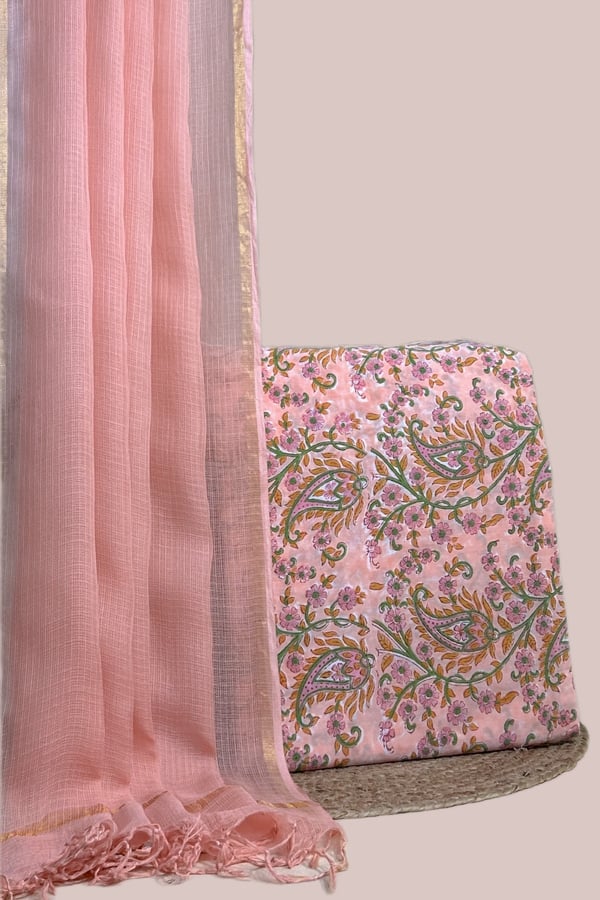 Pink – 2pc Kota Doria Dupatta and Pure Soft Cotton Blockprint Top Fabric Set