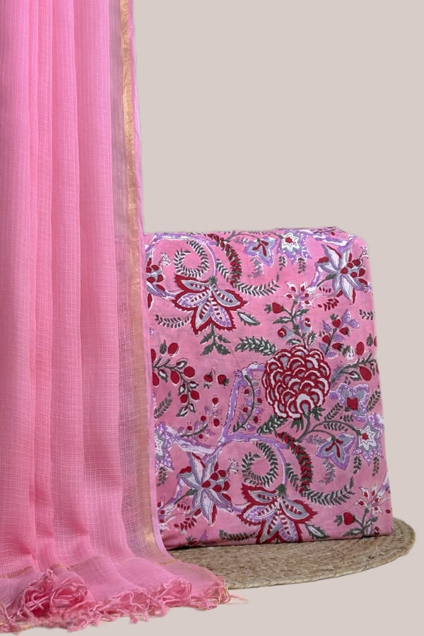 Pink – 2pc Kota Doria Dupatta and Pure Soft Cotton Blockprint Top Fabric Set