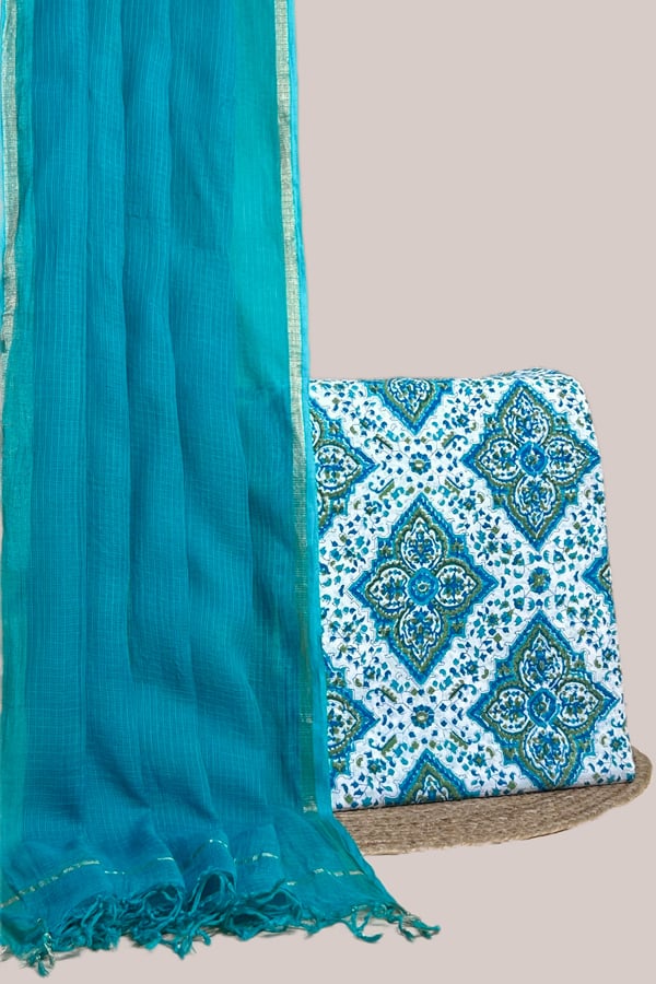White - 2pc Kota Doria Dupatta and Pure Soft Cotton Blockprint Top Fabric Set