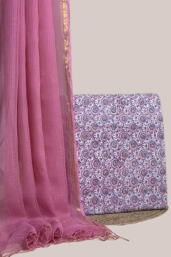 Pink – 2pc Kota Doria Dupatta and Pure Soft Cotton Blockprint Top Fabric Set