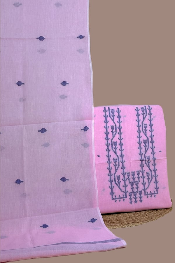 Pink – 3Pc (3mtr Top) Handloom Woven Neck Design Soft Cotton Top(3m) Bottom(2.5m) Fabric Set