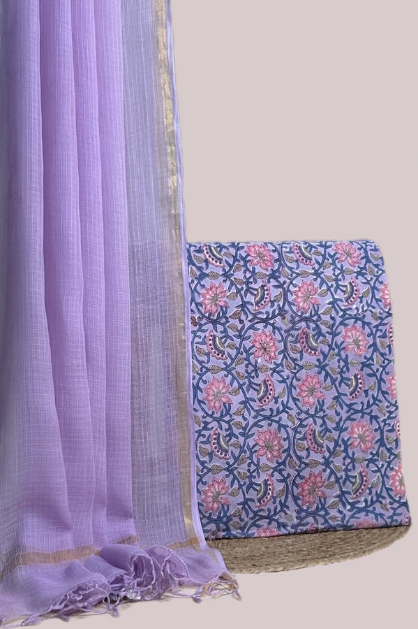Purple – 2pc Kota Doria Dupatta and Pure Soft Cotton Blockprint Top Fabric Set