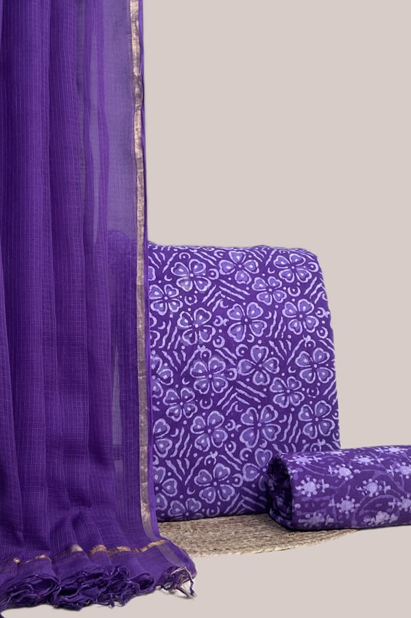 Purple – 3pc Kota Doria Dupatta and Bagru Soft Cotton Top Bottom Fabric Set