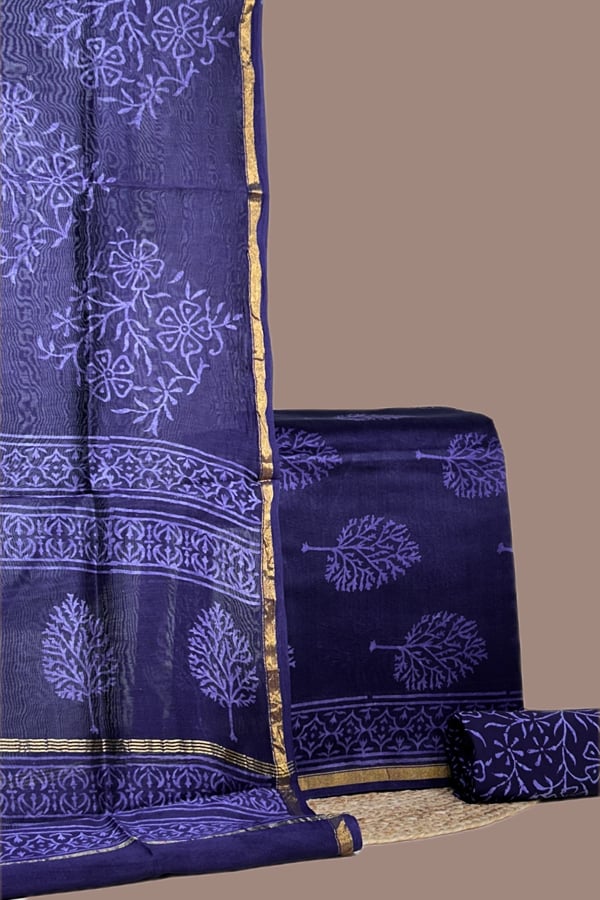 Blue - 3pc Chanderi Silk Dupatta and Top Fabric with Cotton Blockprint Bottom Fabric Set