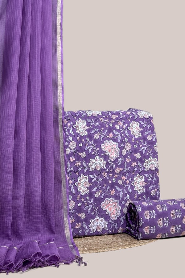 Purple – 3pc Kota Doria Dupatta with Blockprint Pure Soft Cotton Top & Bottom Set