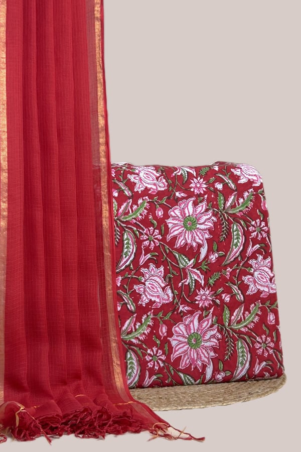 Red – 2pc Kota Doria Dupatta and Pure Soft Cotton Blockprint Top Fabric Set