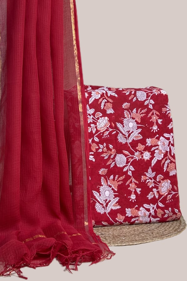 Red – 2pc Kota Doria Dupatta and Pure Soft Cotton Blockprint Top Fabric Set