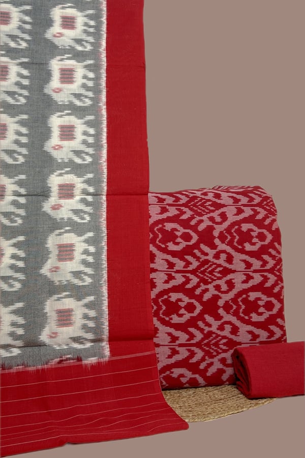 Red – 3pc Ikkat Cotton Dupatta with Soft Ikkat Top And Handloom Soft Cotton Bottom Set