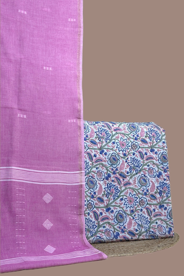 2.5mtr Each – Handloom Cotton Dupatta with HandBlock Printed Pure Soft Cotton Top Fabric Set