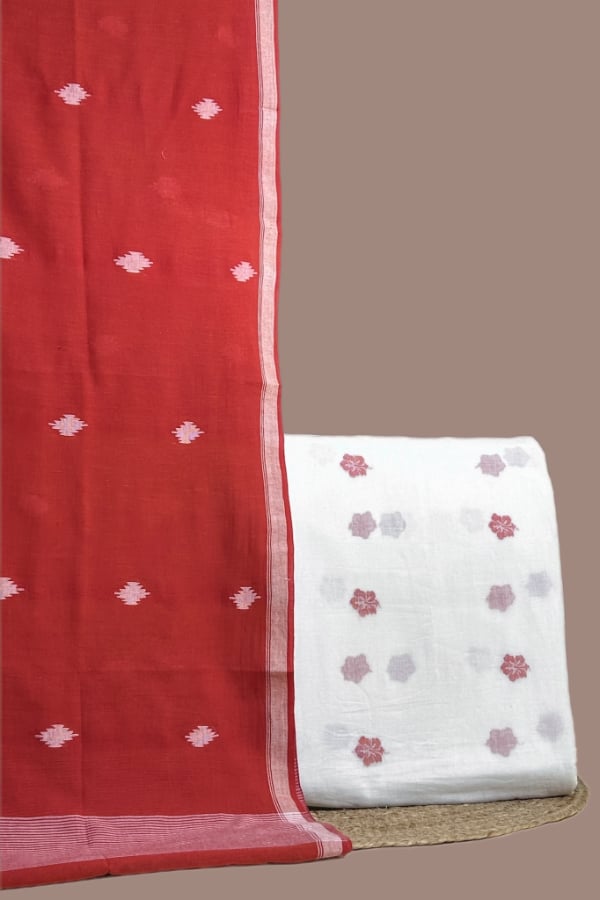 White – 2pc Handloom Cotton Dupatta and Handloom Woven Design Top Fabric Set