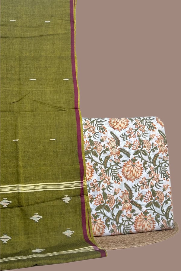 2.50mtr Each– Handloom Cotton Dupatta with HandBlock Printed Pure Soft Cotton Top Fabric Set