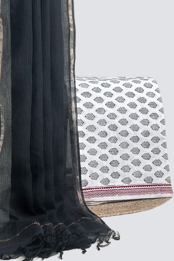 White – 2pc Kota Doria Dupatta and Bagh Blockprint Top Cotton Fabric Set