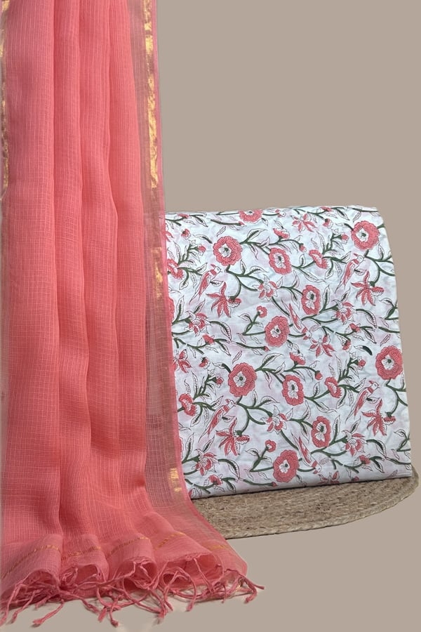 2.5mtr Each – Kota Doria Dupatta with HandBlock Printed Pure Soft Cotton Top Fabric Set