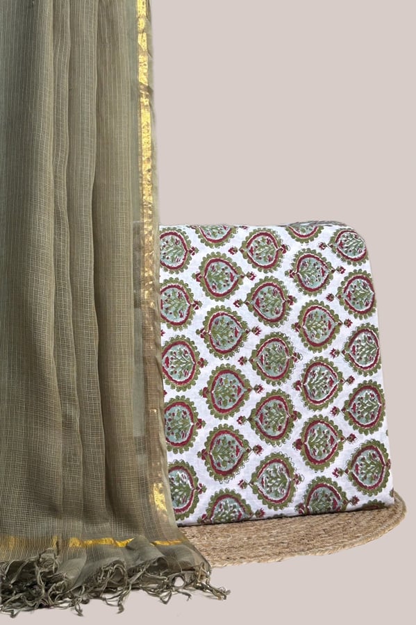 2.5mtr Each – Kota Doria Dupatta with HandBlock Printed Pure Soft Cotton Top Fabric Set