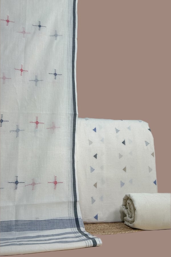 White – 3Pc Handloom Cotton Dupatta with Woven Motif Top & Handloom Soft Cotton Bottom Fabric Set