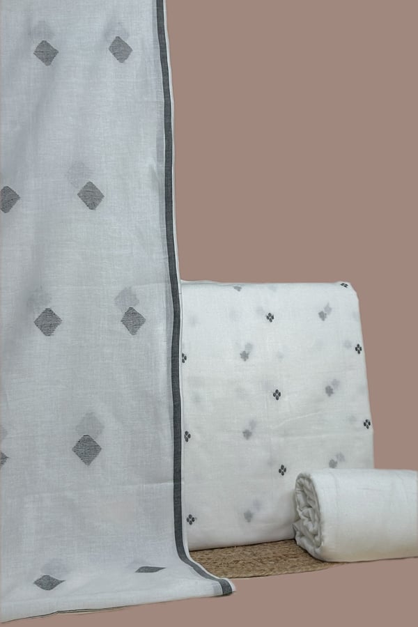 White – 3Pc Handloom Cotton Dupatta with Woven Motif Top & Handloom Soft Cotton Bottom Fabric Set