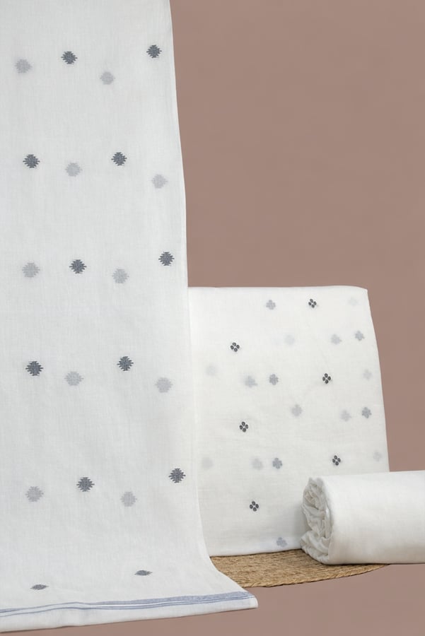 White – 3Pc Handloom Cotton Dupatta with Woven Motif Top & Handloom Soft Cotton Bottom Fabric Set